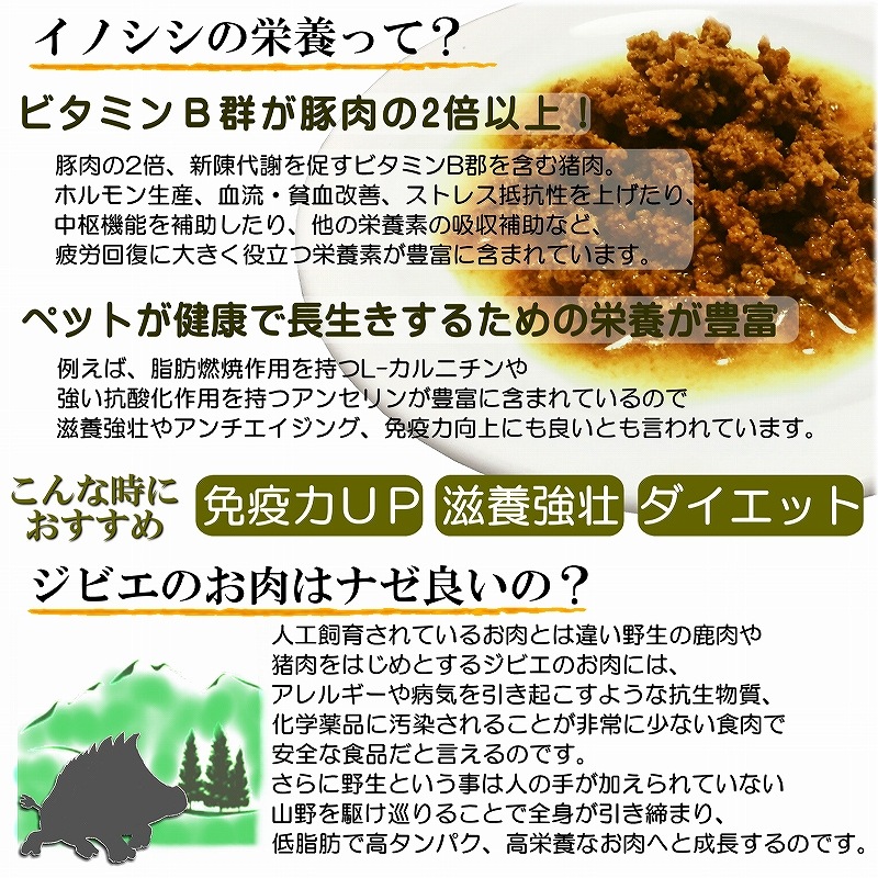 生肉が苦手なわんちゃん・ねこちゃんへ トッピングで、いつものごはんがごちそうに! 高タンパクでビタミンB群、L-カルニチン豊富ないのししは、