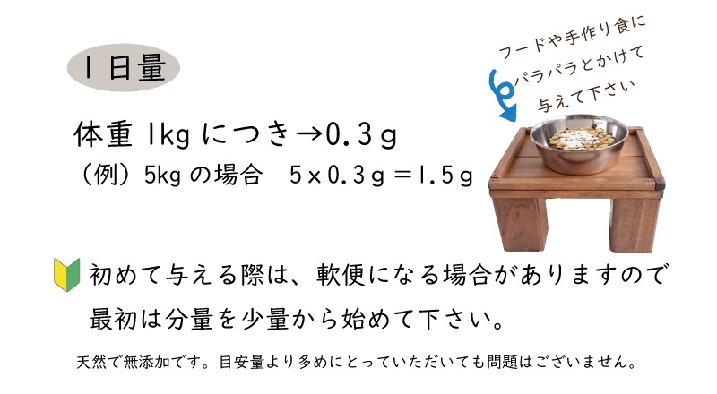 (例)5kgの場合・・・5 x 0.3g = 1日/1.5g 専用スプーン5杯)