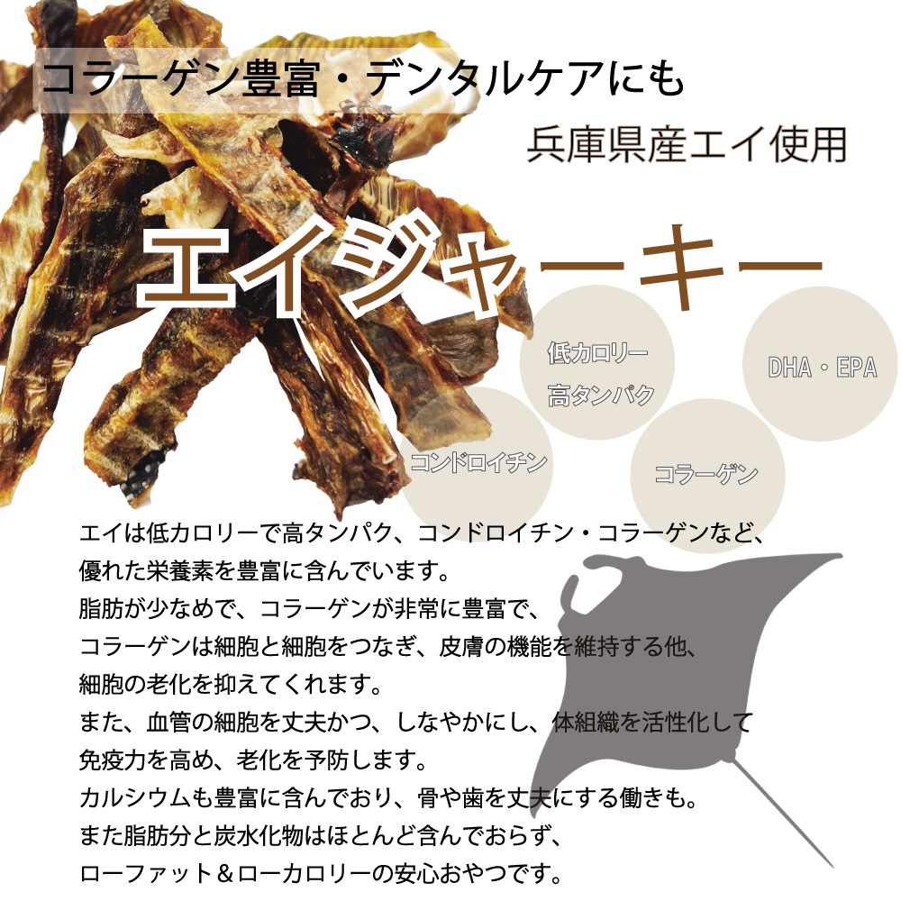 犬のおやつ 海の恵 えい 無添加エイジャーキー50g 兵庫県産 ビタミンB12・コラーゲンたっぷり!眼精疲労や皮膚・被毛のハリ・ツヤに!パピーからシニアまでデンタルケアにも 国産ふぞろい天然健康食材エイ 愛犬・ネコの体に優しいおやつ 帝塚山WANBANAワンバナ